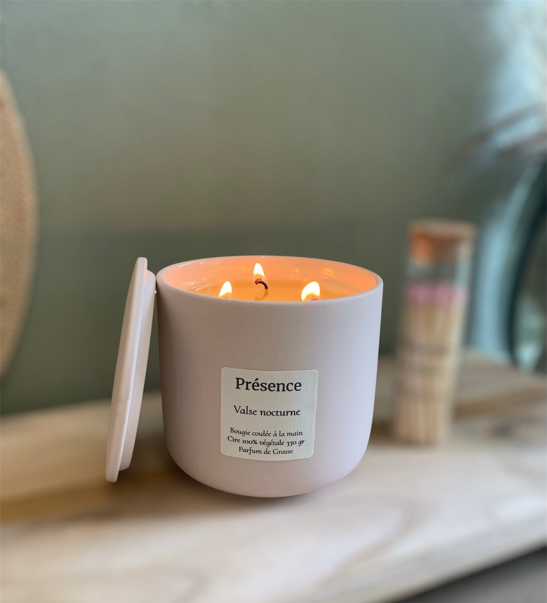 Une fois allumée, laisser la bougies brûler jusqu’à ce que la cire soit fondue sur la totalité de la surface, pour qu’elle ne se creuse pas (1h30 minimum).