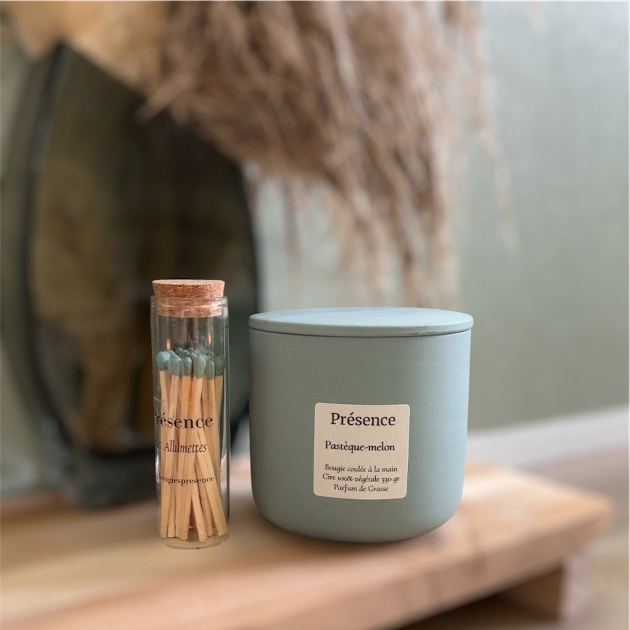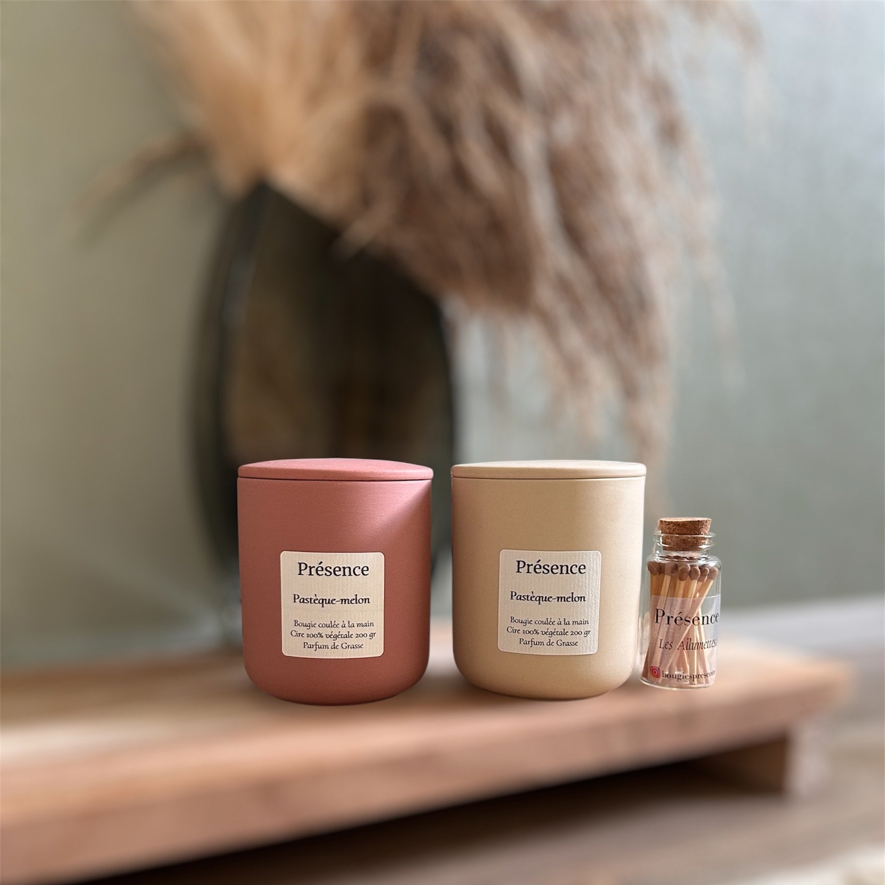 Bougie coulée à la main, composée de cire de Colza sans OGM ni pesticides, de mèches de coton et de parfums élaborés à Grasse sans CMR (substances cancérigènes, mutagènes, toxique pour la reproduction).